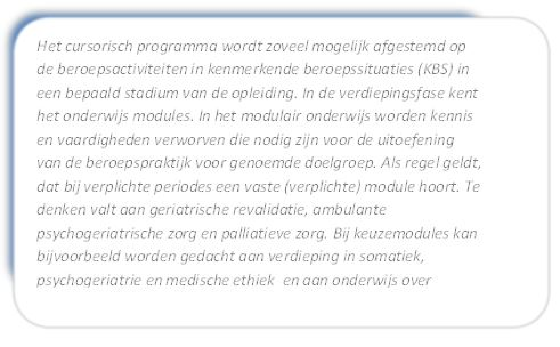 Tot slot, maar essentieel, is de introductie van kenmerkende beroepssituaties. Dit is in ieder geval essentieel om de noodzakelijke competenties van aios effectiever te kunnen ontwikkelen. Zoals wij eerder aanhaalden gaan aios en opleider met behulp van kenmerkende beroepssituaties gericht te werk, gecombineerd met een goede toetsmethodiek. Het hele werkveld van de specialist ouderengeneeskunde komt hierbij aan bod, inclusief de nieuwe eisen die aan de specialist ouderengeneeskunde worden gesteld.