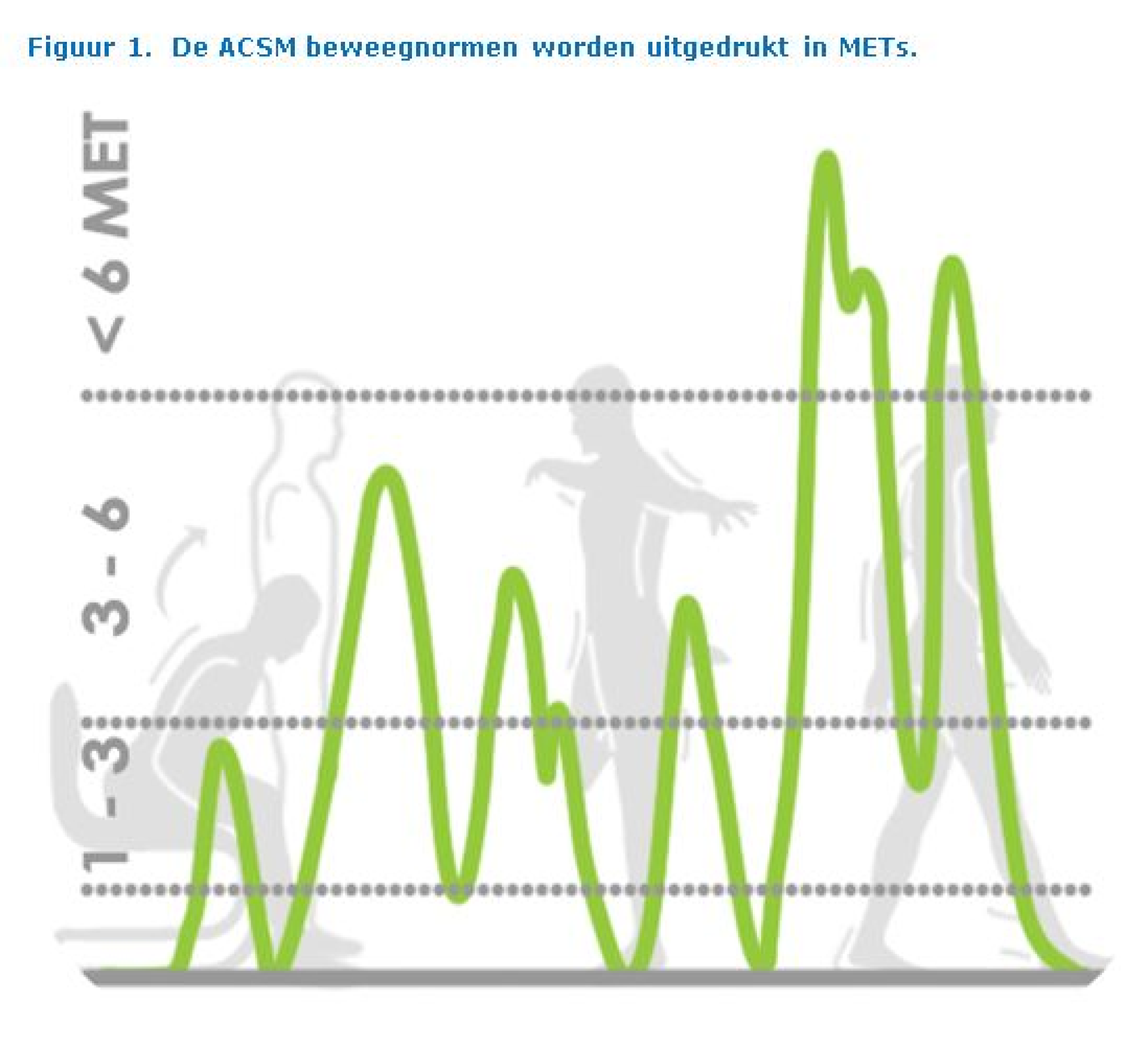 De ACSM adviseert om vijf dagen per week matig intensief (3-6 MET) te bewegen in aaneensluitende periodes van 10 minuten of drie dagen per week 20 minuten hoog intensief (> 6 MET) te bewegen in aaneensluitende periodes van 10 minuten (zie figuur 1).14