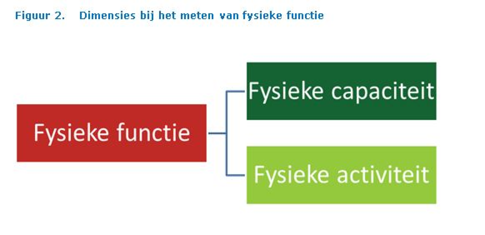 Fysieke functie kan op twee manieren gemeten worden (zie figuur 2). Fysieke capaciteit is het vermogen om mobiel te zijn, zoals lopen en opstaan. Bij fysieke capaciteit onderscheiden we een vaardigheid (kwaliteit) en een inspanningsaspect. Vaardigheid is het vermogen om een handeling bekwaam uit te voeren. Inspanningscapaciteit is het vermogen om een activiteit langere tijd vol te kunnen houden. Fysieke capaciteit wordt gemeten met gestandaardiseerde fysieke testen die meestal gesuperviseerd worden afgenomen. Er zijn testen voor bijvoorbeeld lopen, balans, opstaan en combinaties van deze vaardigheden. Als daar bij gevraagd wordt om de activiteit zo snel mogelijk uit te voeren of zo lang mogelijk vol te houden ligt het accent meer op inspanningsvermogen. Onder fysieke activiteit verstaan we het beweeggedrag in het dagelijks leven (kwantiteit). Deze wordt gemeten door zelfrapportage of met beweegmonitoren (activity monitors). Met fysieke vaardigheidstesten wordt bepaald wat iemand kan terwijl meting van fysieke activiteit laat zien wat iemand feitelijk doet. De samenhang tussen fysieke capaciteit en fysieke activiteit is slechts beperkt. Dit betekent dat verbetering van de fysieke vaardigheid zich niet automatisch vertaalt in een toename van fysieke activiteit.
