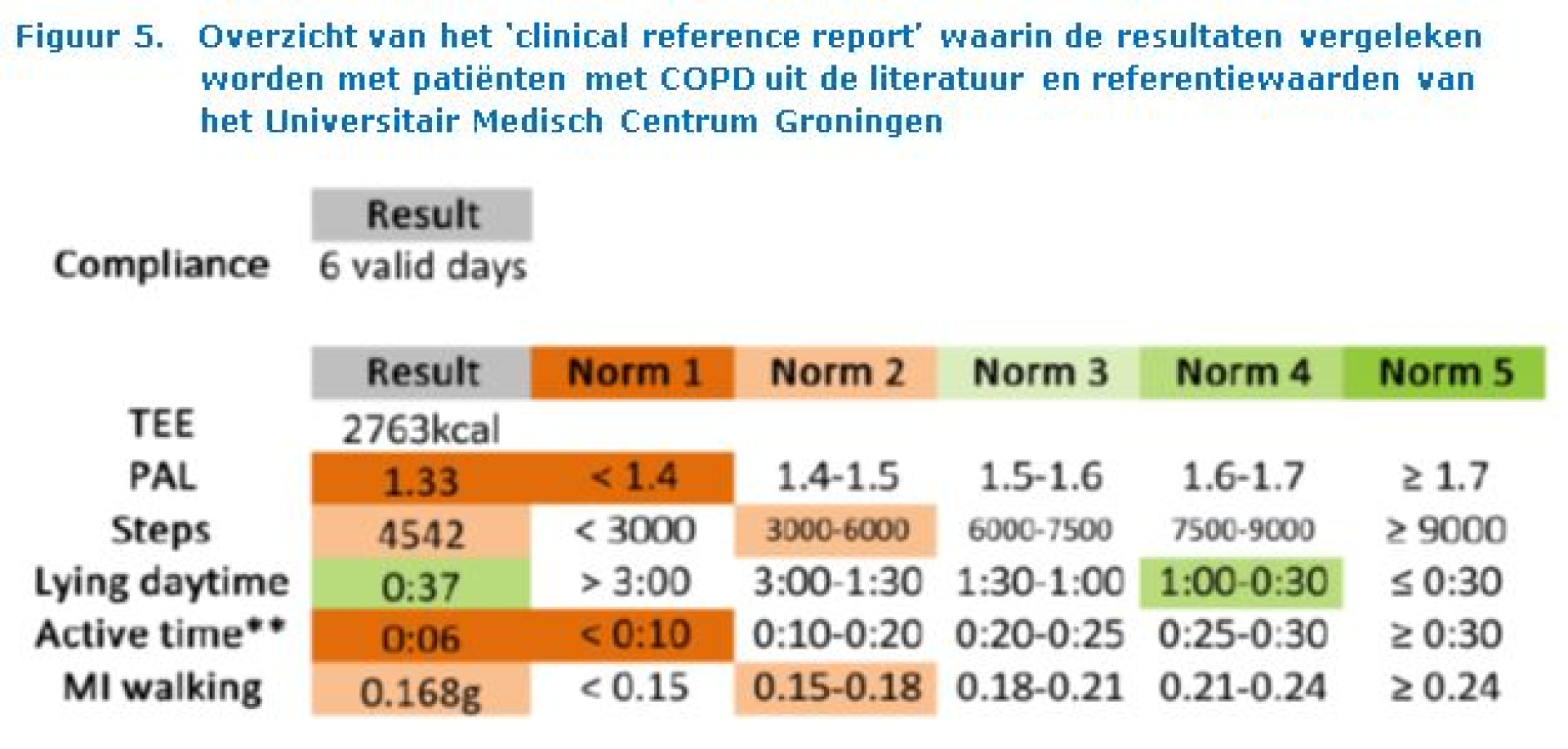 De toepassing in de zorg van de activiteiten monitor heeft ertoe geleid dat er speciale rapporten voor COPD patiënten ontwikkeld werden (zie figuur 5). De normen zijn gebaseerd op uitkomsten van beweeggedrag van COPD patiënten in internationale literatuur. Hierbij worden verschillende normwaarden gebruikt zoals het totale energieverbruik (TEE), het physical activity level (PAL), het aantal stappen, de ligduur overdag, de actieve tijd en de bewegingsintensiteit van het lopen. Dit rapport (zie figuur 5) is ontwikkeld in samenwerking met klinische gebruikers van de beweegmonitor. In het rapport (zie figuur 6) worden de volgende parameters gebruikt :