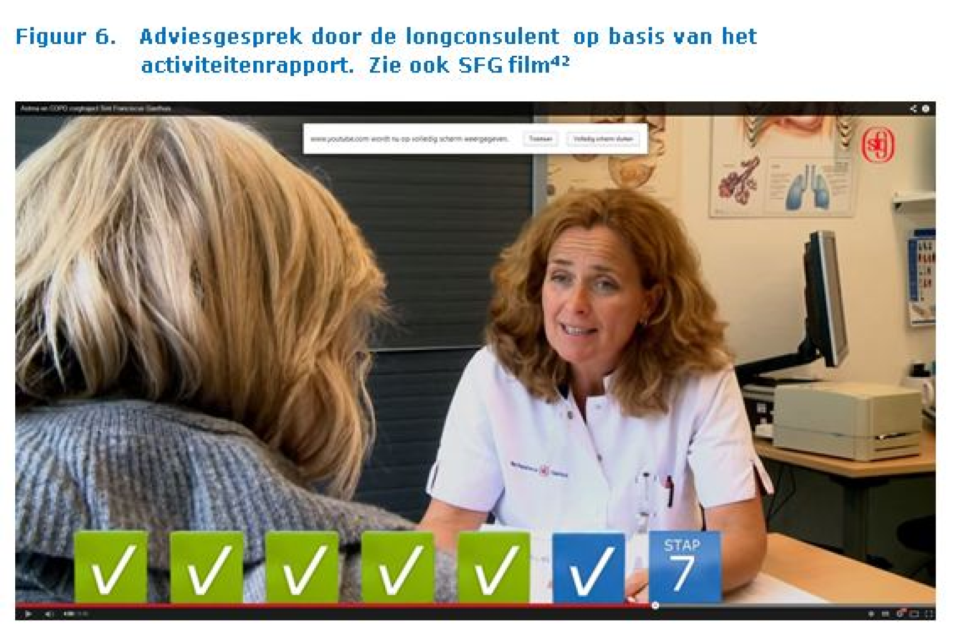 In figuur 5 wordt een deel van dit rapport weergegeven. Juist door de gedetailleerde informatie is het mogelijk om samen met de patiënt tot een passend advies te komen dat rekening houdt met de uitgangssituatie en de mogelijkheden en motivatie van de betrokkene. De longconsulent heeft een adviesgesprek met de patiënt op basis van deze rapportage (zie figuur 6).