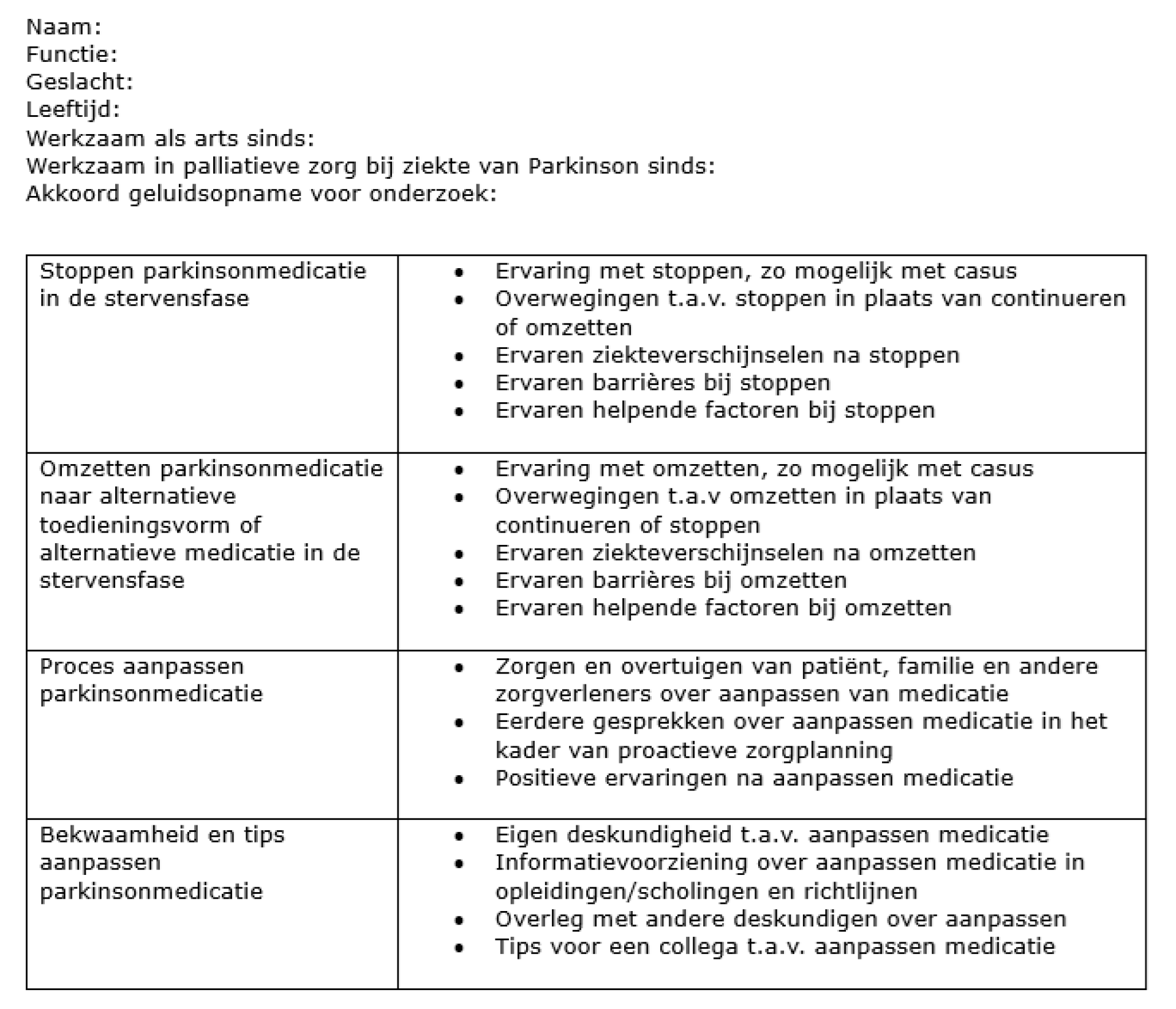 De groep artsen bestond uit één man en zeven vrouwen en zij waren tussen 2.5 en 33 jaar werkzaam als arts in de palliatieve zorg bij patiënten met de ziekte van Parkinson. Er namen vijf specialisten ouderengeneeskunde deel uit verschillende zorgorganisaties, twee neurologen uit verschillende ziekenhuizen en één huisarts werkzaam in de ouderenzorg.